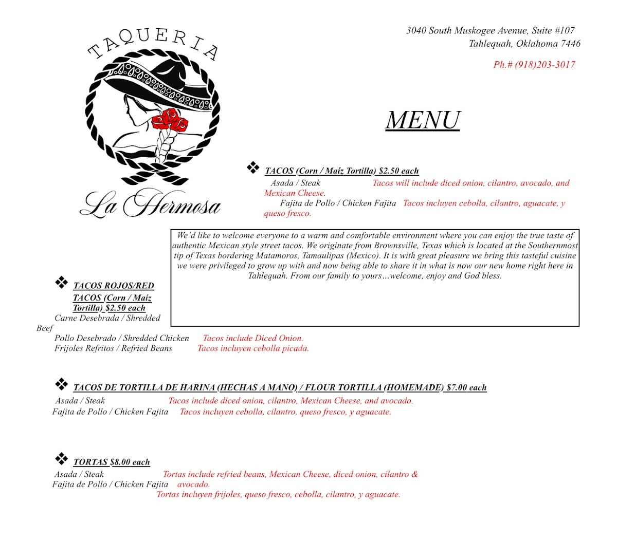 Welcome to Taquería La Hermosa, a hidden gem nestled in Tahlequah, Oklahoma. This restaurant takes pride in offering authentic Northern Mexican cuisine, ensuring that your taste buds are treated to vibrant flavors and traditional dishes. From the comforting carne asada tacos wrapped in soft flour tortillas to the rich and flavorful Charro beans, each plate is crafted with care and attention to authenticity.